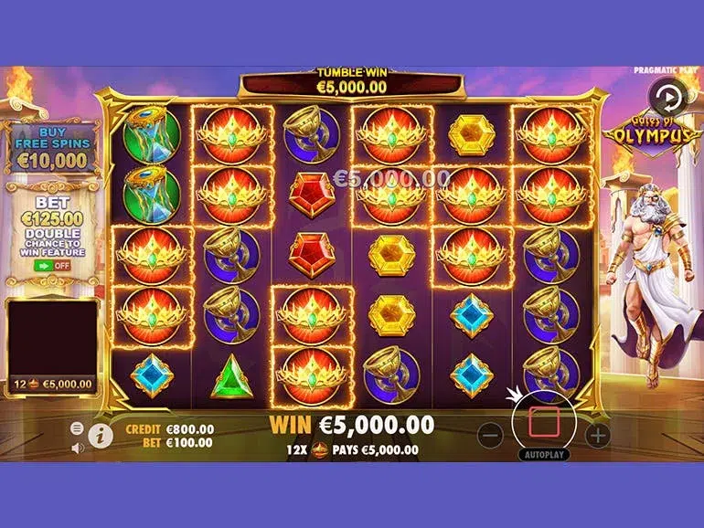Gates of Olympus is a Greek mythology-themed slot by Pragmatic Play featuring a 5,000x max win and a unique multiway pay system. It is a high-volatility game with an RTP of 96.5%. The highlight is the free spins feature, triggered by four or more “Scatters”, which grants 15 spins where all landed multipliers accumulate to boost your total winnings.